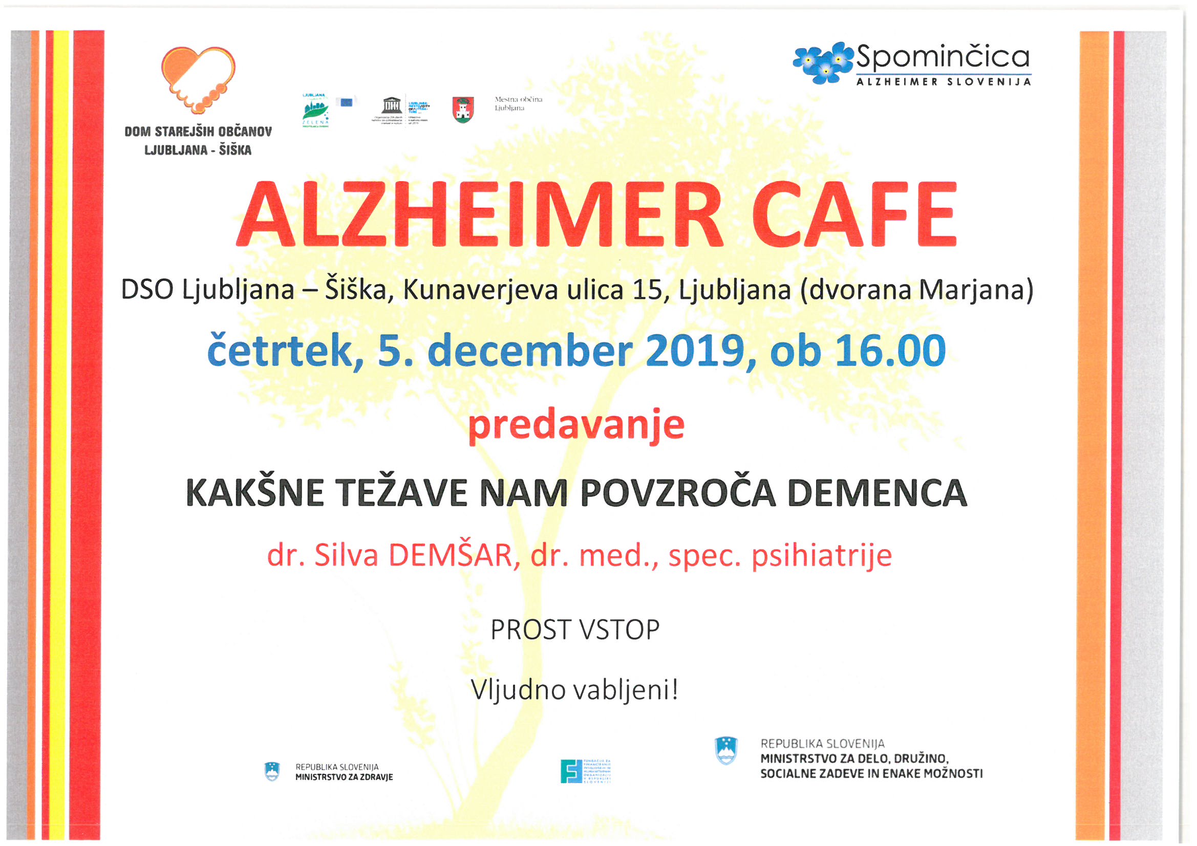 V četrtek, 5. decembra 2019 ob 16.00 bo naša gostja dr. Silva DEMŠAR, dr. med., spec. psihiatrije s predavanje: KAKŠNE TEŽAVE NAM POVZROČA DEMENCA.