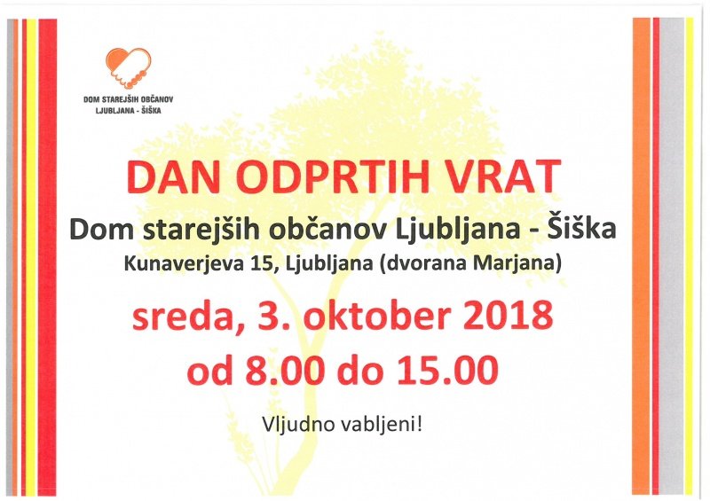 V SREDO, 3. oktobra 2018 bo v Domu starejših občanov Ljubljana – Šiška potekal DAN ODPRTIH VRAT (program).