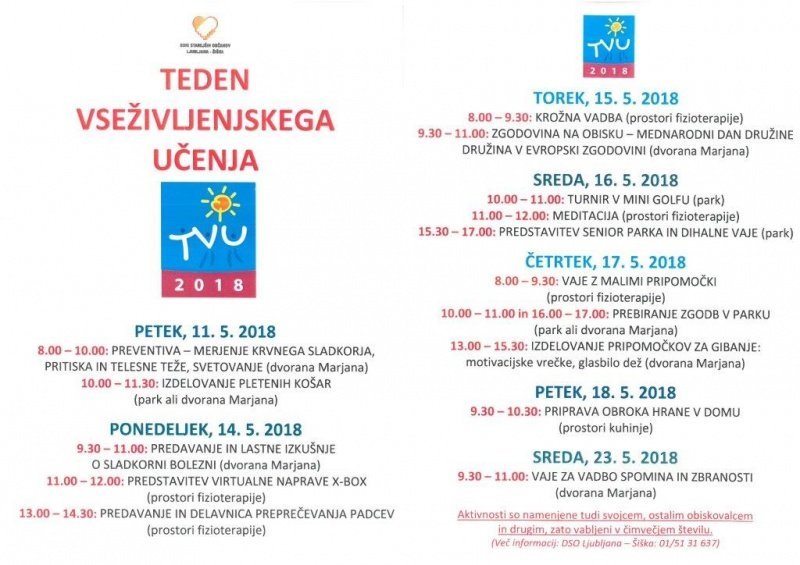 V petek, 11. maja 2018 pričnemo z aktivnostmi v okviru vseslovenskega projekta TEDEN VSEŽIVLJENJSKEGA UČENJA. Različne športne, ustvarjalne delavnice, predavanja, druženja in še več, se bo dogajalo do 23. maja 2018. Aktivnosti bodo predstavile življenje stanovalcev v našem Domu.